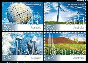 | 备注 | (Renewable Energy) 2004年3月30日澳大利亚邮政发行一套4枚《可再生能源》,展现澳洲可再生能源的多样性。这些可再生能源目前只能占澳洲总能源需求的9%,澳洲能源的80%来自煤炭,但是这9%已经减少了数千吨的二氧化碳气体的排放。与煤炭、石油和天然气相比,可再生能源具有安全、清洁和环保的特点以及可再生这个最优异的特性。根据澳洲联邦政府2000年通过的可再生能源(电力)法案,定额外的电能都要使用可再生电力,虽然价格高于传统的能源,随着技术的技术和发展,采用可再生电能的成本在不断下降。这次发行的四枚邮票表现了太阳能、风能、水利资源和生物质能(biomass)。这套邮票总面值为2.00澳元,邮票规格为37.5X126mm, 齿孔为13.86 X 14.6度,一版50枚,由Sean Pethick设计。 | ||