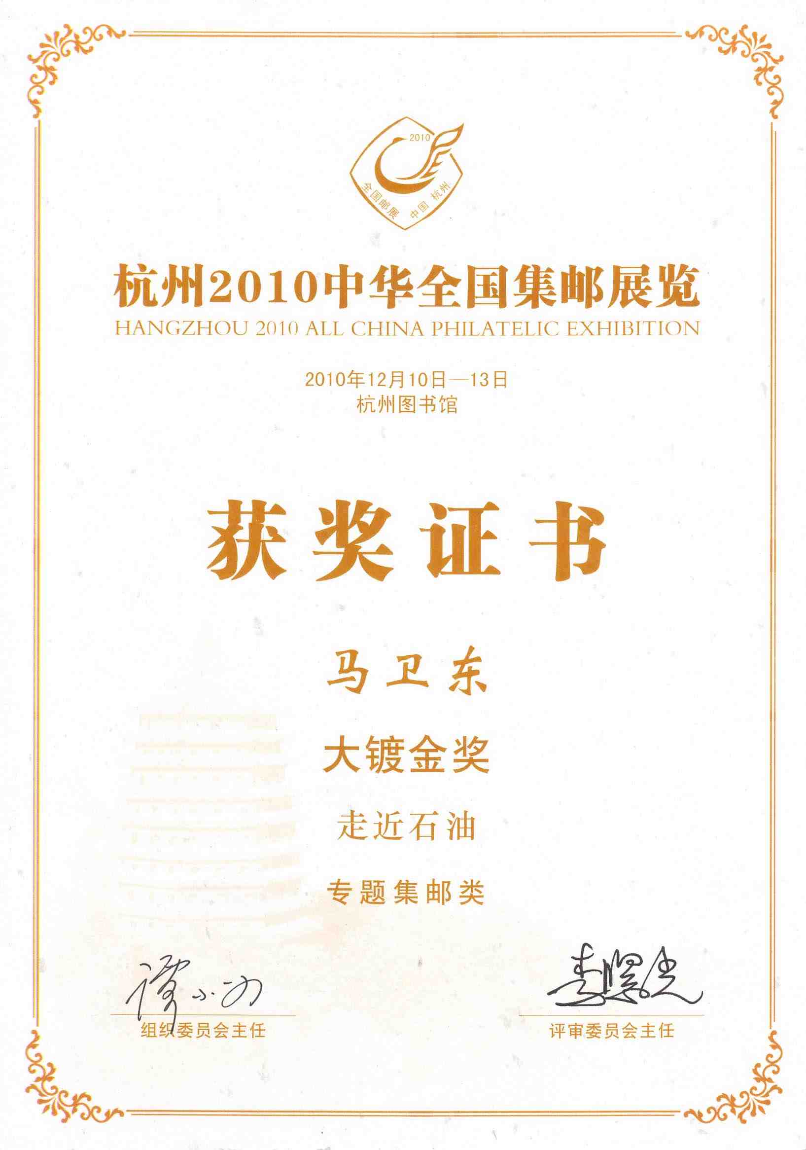 2010年12月10日-13日在浙江杭州举办的2010年中华全国集邮展览日前结束。本站站长马卫东的专题邮集《走近石油》(五框80个贴片)荣获大镀金奖。 吉林选送竞赛类展品4部全部沾“金”,其中:马卫东《走近石油》专题(科技)类邮集5框,荣获85分大镀金奖、杨承录《中华邮政限省“区”贴用邮票》传统类邮集5框,荣获81分镀金奖、祝业平《新中国航空邮票》传统类邮集5框,荣获82分镀金奖、祝业平《中国第一套生肖邮票》一框(传统)类邮集,荣获90分一框类金奖。
