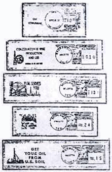 根据万国邮联的规定,邮资机符志的印迹由三部分组成。第一部分与邮政日戳相似,第二部分表示国名和邮资,第三部分可以采用宣传文字和相关图案。对于专题邮集来说,邮资机符志上所能传递的专题信息,一般来说就是来自这后一部分。请看下面一组在美国各地使用的与石油专题有关的邮资机符志: